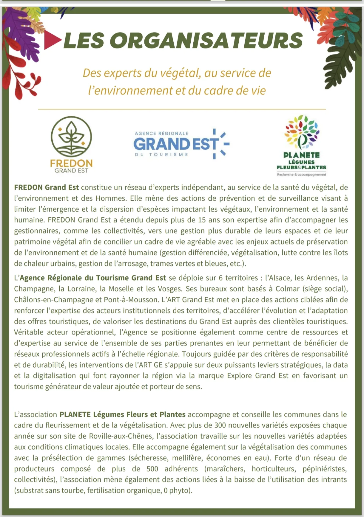 - FREDON Grand Est : Réseau d’experts indépendant dédié à la santé du végétal, de l’environnement et des Hommes. Il agit en prévention et surveillance des espèces nuisibles, et accompagne les gestionnaires dans une gestion écologique des espaces verts.